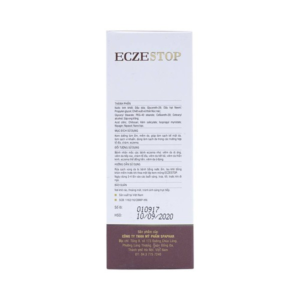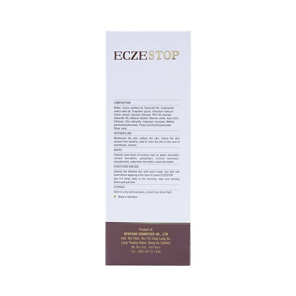 Eczestop- Kem bôi trị viêm da cơ địa giúp giảm dị ứng, bớt ngứa ngáy, cải thiện tình trạng tổn thương da thông qua tác dụng của kẽm salicylate, nano bạc, dịch chiết neem và chiết xuất vỏ núc nác. Giúp dưỡng ẩm, làm sạch da và tăng cường sức khỏe của làn da nhờ có dầu dừa, chitosan. Sản phẩm này có thành phần từ thiên nhiên nên rất an toàn khi sử dụng.
