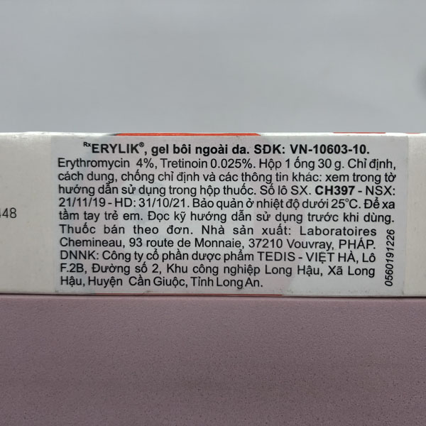 Erylik- Kem trị mụn làm sạch các lỗ chân lông bị bít tắc, giúp giảm tạo thành các đốm mụn. Khi lỗ chân lông không bị bít tắc, bã nhờn có thể thoát ra ngoài nên hạn chế vi khuẩn phát triển.