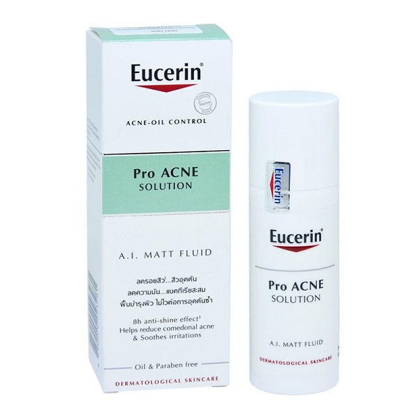 - Kem kiểm soát dầu giảm mụn Eucerin Pro Acne Solution A.I Matt Fluid giúp kiềm dầu suốt 8 giờ. Đồng thời giảm mụn đầu trắng, mụn đầu đen và làm dịu da với các thành phần chính: