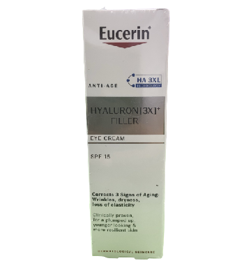 Kem dưỡng ngăn ngừa lão hóa vùng mắt Eucerin Anti Age Hyaluron Filler Eye Cream là một sản phẩm thuộc bộ chăm sóc da lão hoá Hyaluron Filler sẽ giúp kết hợp các chuỗi Hyaluronic Acid dài và ngắn với nhau, đồng thời chứa hoạt chất sinh hoạt Glycine Saponin, thành phần giúp tăng cường quá trình tổng hợp Hyaluronic Acid trong da.