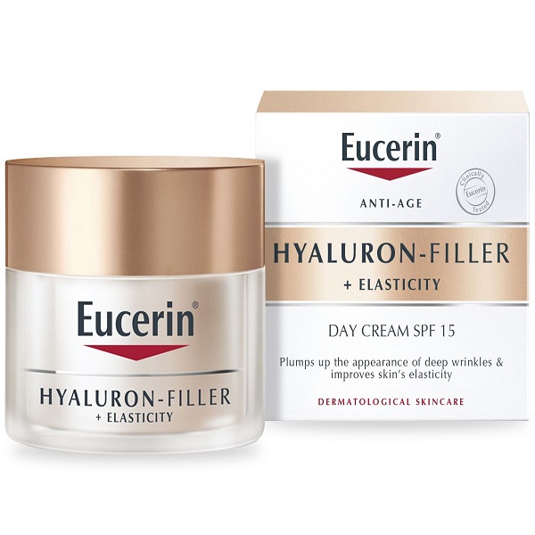 Kem dưỡng ban ngày chống lão hóa Eucerin Hyaluron Filler + Elasticity Day SPF15 bao gồm sản phẩm dành cho ban đêm và ban ngày riêng biệt sẽ tập trung giải quyết các vấn đề da có nhiều nếp nhăn, da chảy xệ và kém đàn hồi, đồng thời hỗ trợ bảo vệ da trước các tác hại từ môi trường nhằm đảm bảo làn da có được sự chăm sóc cần thiết trong mọi giai đoạn của quá trình lão hóa. Sản phẩm có kết cấu kem mỏng nhẹ, dễ dàng thấm nhanh vào da, không gây tắc lỗ chân lông làm sinh mụn.