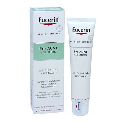Tinh chất làm giảm mụn Eucerin ProAcne A.I Clearing Treatment là bộ sản phẩm cung cấp các giải pháp dược mỹ phẩm cho da nhờn và da mụn. Sự kết hợp các thành phần của sản phẩm điều trị bốn nguyên nhân chính gây da mụn: hội chứng dày sừng (rối loạn chuyển hóa tế bào da), seborrhea (tăng tiết bã nhờn), tăng sinh vi khuẩn và viêm da. Các nghiên cứu da liễu lâm sàng đã cho thấy các sản phẩm Eucerin ProAcne có hiệu quả và rất tốt trong việc tăng cường sức đề kháng của da.