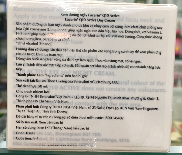 Thành phần của Eucerin Q10 Active Day Cream – Kem dưỡng ngừa lão hóa ban ngày cho da nhạy cảm