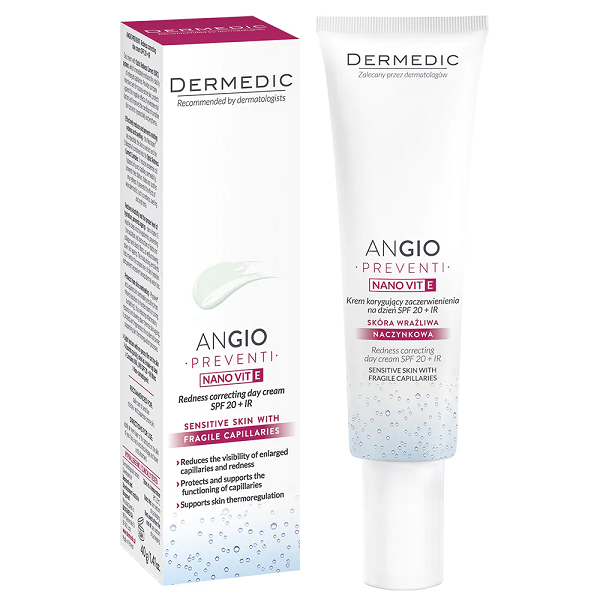 Kem dưỡng tái tạo da ban ngày Dermedic Angio Preventi Nano Vit E Redness Correcting Day Cream SPF 20+IR là kem làm dịu và che bớt các mao mạch dưới da. Vì kem dưỡng có màu nhẹ, phù hợp với làn da châu Á, tạo lớp che khuyết điểm cho làn da giãn mao mạch, da mỏng yếu thường xuyên nổi ửng đỏ. Đặc biệt với hoạt chất Vitamin E dạng nano siêu nhỏ dễ dàng đi sâu vào các lớp tế bào da, giúp tái tạo từ bên trong, phục hồi tổn thương da mang lại sự mềm mịn. Tạo lớp màng bảo vệ da trước ánh mặt trời.