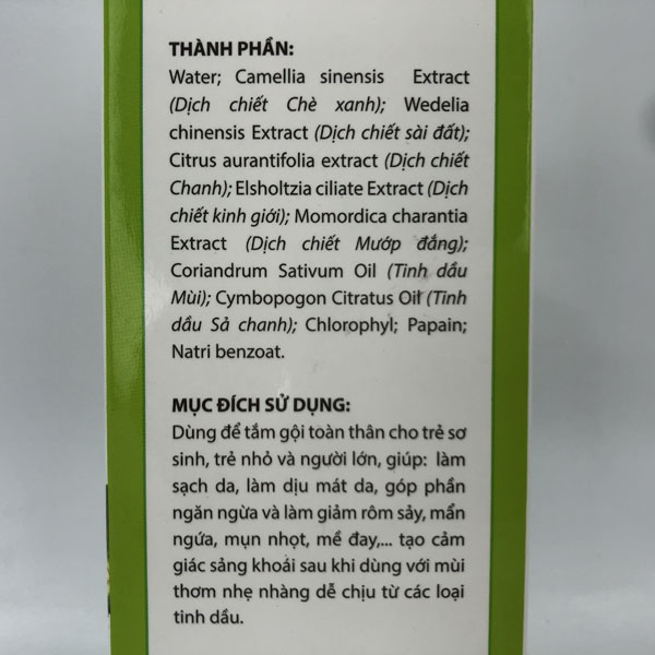 - Water, dịch chiết chè xanh, dịch chiết sài đất, dịch chết chanh, dịch chiết kinh giới, dịch chiết mướp đắng, tinh dầu mùi, tinh dầu sả chanh, chlorophyl, papain, natri benzoat.