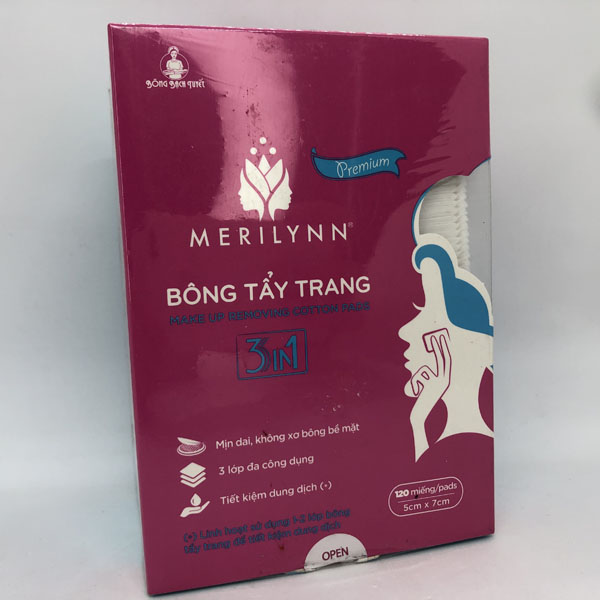 Premium Merilynn- Bông tẩy trang với 3 công dụng trong 1 miếng bông tẩy trang đã làm nên điều khác biệt, tăng giá trị sử dụng của người tiêu dùng. Ngoài việc vệ sinh da mặt hàng ngày, tách từng lớp để tiết kiệm dung dịch toner khi lau toner mỗi sáng tối, công dụng nổi trội của bông tẩy trang Merilynn Premium 3in1 là đắp lotion mask.