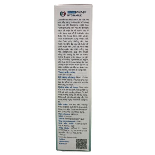 DottorPrimo Hydramilk là sữa rửa mặt, tẩy trang dưỡng ẩm với công thức cải tiến Neozone 4000 Dầu Hướng Dương lon Hoá hỗ trợ làm sạch bề mặt da và sạch sâu lỗ chân lông, loại bỏ đi bụi bẩn, dầu thừa, lớp trang điểm.