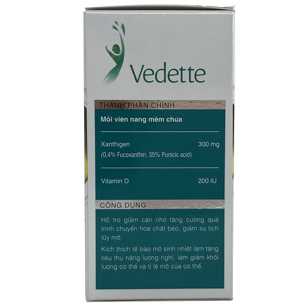 Vedette- Viên giảm cân ban đêm có thành phần chính là hoạt chất Xanthigen, chất này có nguồn gốc từ rong biển nâu và dầu hạt lựu đã được phát hiện là có thể giúp đốt cháy mỡ thừa hiệu quả trong khi chúng ta ngủ.