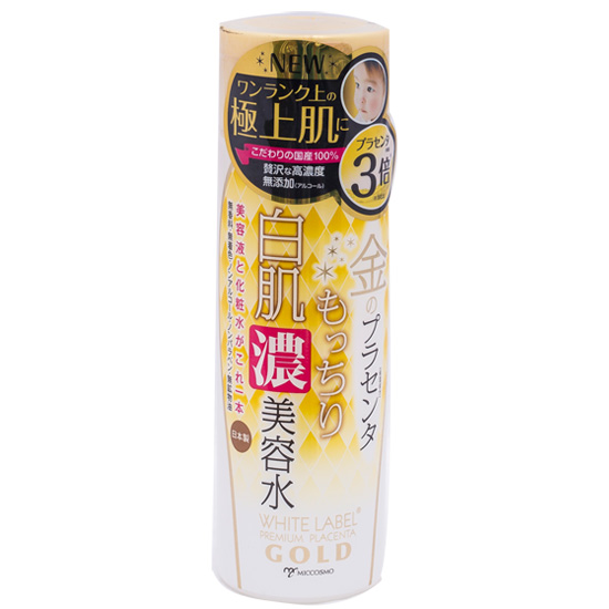 - Essence đậm đặc nhau thai và collagen dưỡng trắng White Label Placenta Rich Gold Essence dạng essence thẩm thấu sâu vào da và lấy đi tất cả những lo lắng về tình trạng da khô, dạ sạm dày và lão hóa, mang lại làn da mịn màng như da em bé.