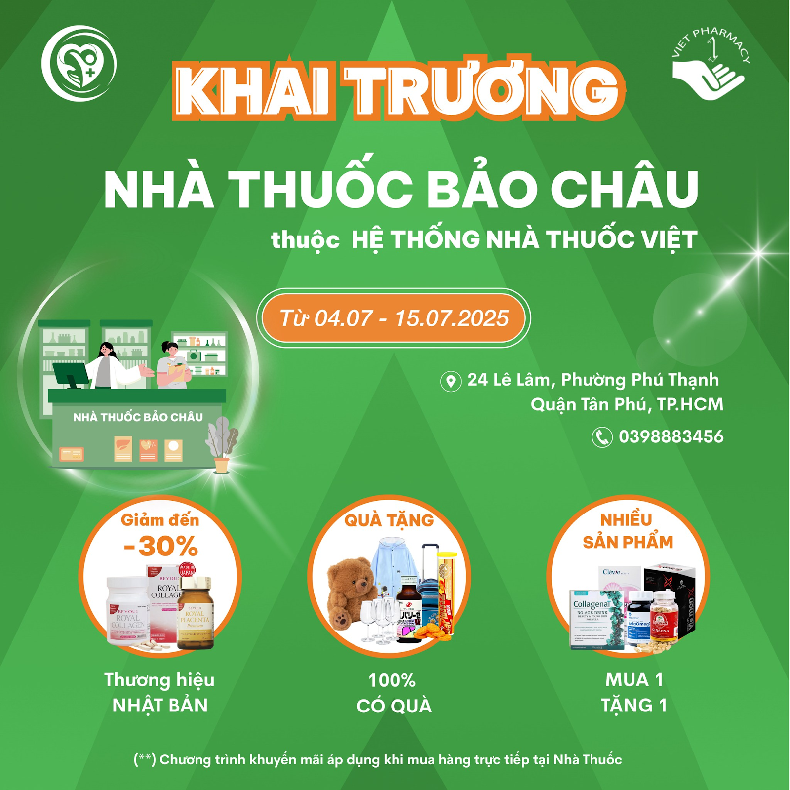 Nhà thuốc Bảo Châu – thành viên thuộc Hệ thống Nhà thuốc Việt – đã chính thức khai trương vào ngày 4/7/2025 tại số 24 Lê Lâm, phường Phú Thạnh, quận Tân Phú (cũ), TP.HCM. Sự kiện này đánh dấu một bước tiến quan trọng trong hành trình phát triển của Nhà thuốc Việt, với mục tiêu mang đến sự thuận tiện và góp phần chăm sóc sức khỏe cho cộng đồng cư dân khu vực Tân Phú.
